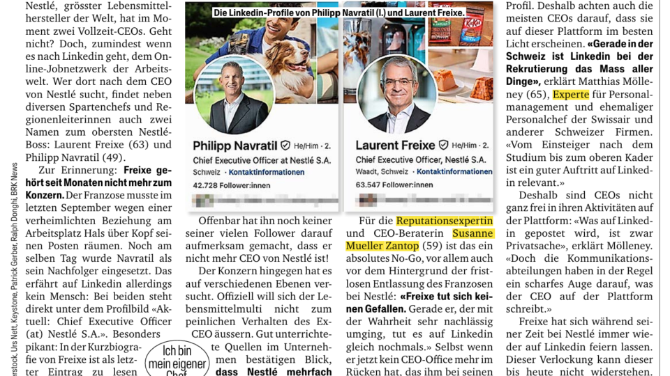 The founder, Susanne Müller-Zantop, positions the company at the intersection of executive strategy, stakeholder communication and performance-ready visibility, turning analysis into actionable positioning. Clients are CEOs and their leadership teams in global or high-profile organizations who want board-ready clarity on what to protect, what to fix, and how to translate insight into a reputation-led roadmap across narrative, appearances, social media and video.